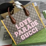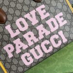 Reflecting the essence of the runway show, a ‘Love Parade Gucci’ print decorates this square-shaped tote bag, echoing the same j...