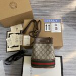 The world of Ophidia evolves with the introduction of a mini bucket bag shape. Crafted in GG Supreme canvas with inlaid green and red Web st...