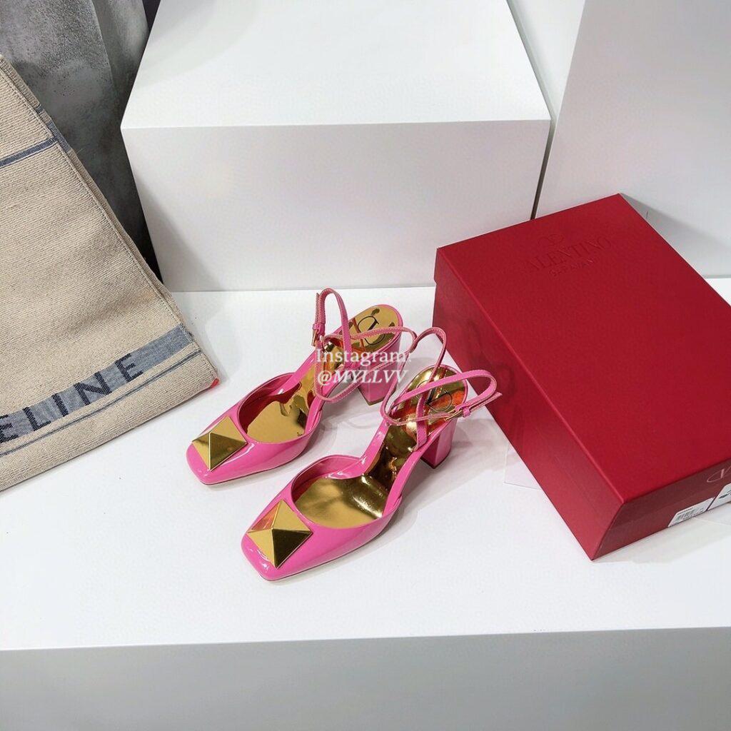 Top Quality Version:MYLLVV » Valentino Big Gold Rivet Patent Leather High Heel Sandal Shoe Rose Red