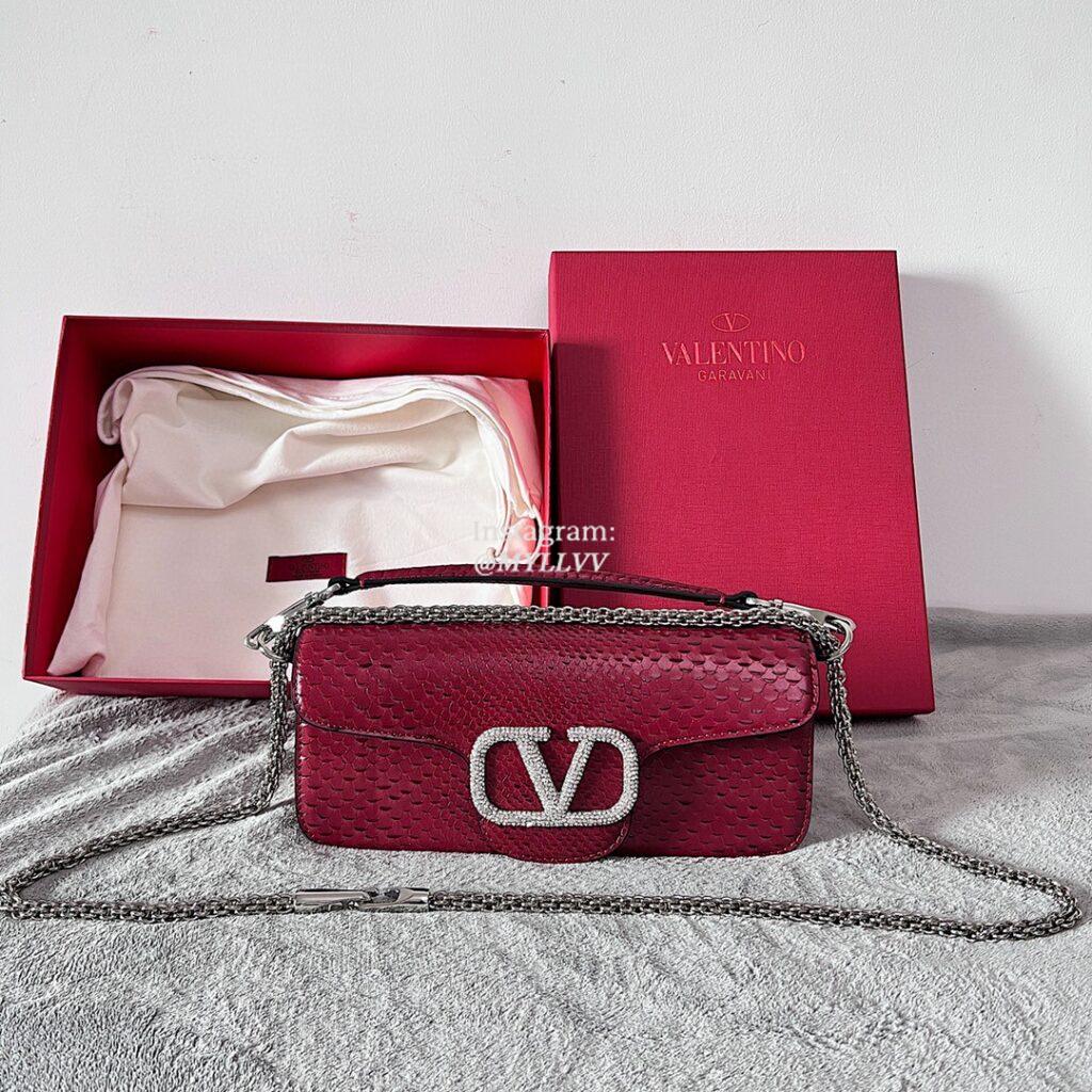 Top Quality Version:MYLLVV » Valentino Snake Skin Diamond V Logo Signature Small Loco Bag Rose Red 22011L